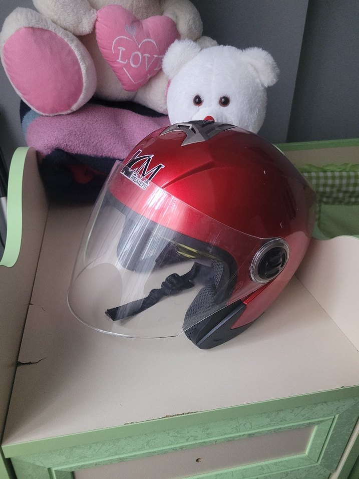 Kırmızı renkli, parlak yüzeyli ve baskılı desenli biker motosiklet kaskıdır. Plastik malzemeden üretilmiş, şeffaf vizöre sahiptir. Minimalist ve sade tasarıma sahiptir. ️