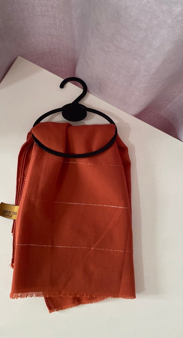 Kırmızı, parlak ve dökümlü tasarıma sahip kadın şalı, yumuşak sentetik kumaştan üretilmiş, minimalist bohem tarzını yansıtıyor.