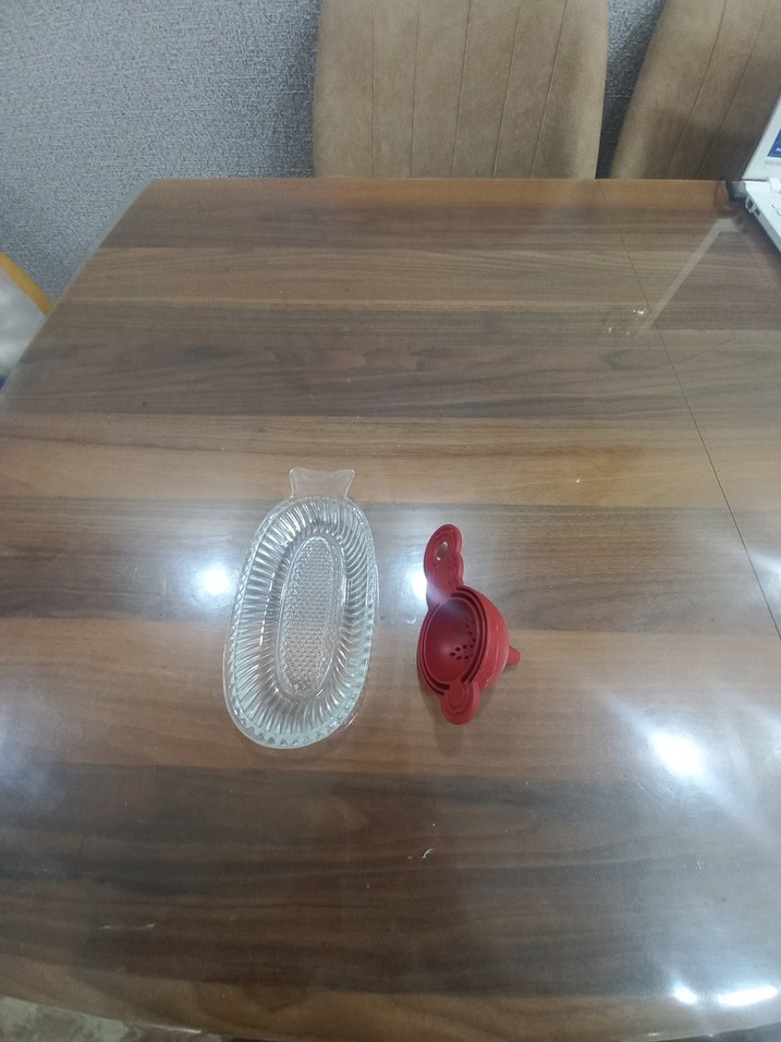 Kırmızı parlak çay süzgeci ve desensiz cam tabak, çay servisinde kullanılabilir.