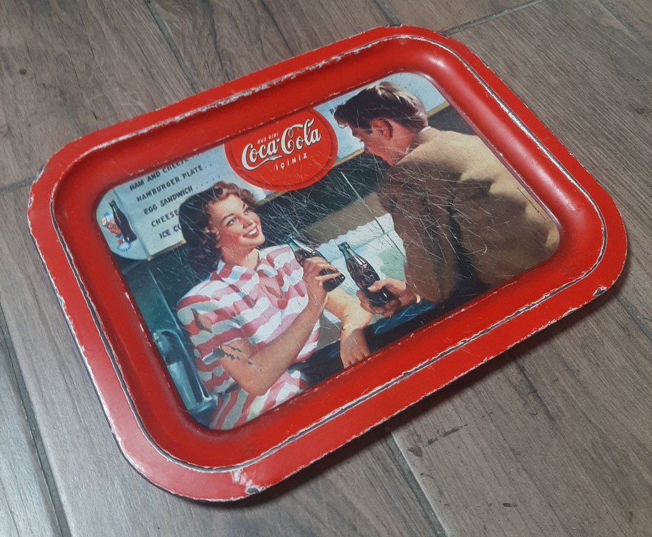 Parlak kırmızı renkte, Coca-Cola logosu ve iki kişinin içecek keyfi yaptığı vintage reklam görünümlü tepsi