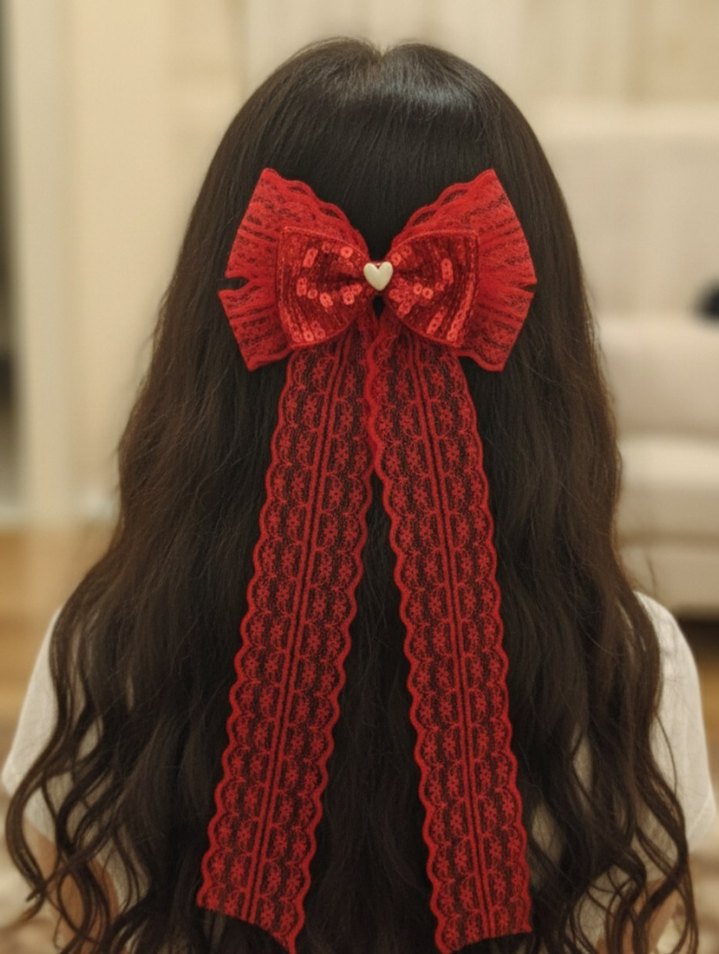 Kırmızı parlak payettalen oluşan bu saç aksesuarı, fiyonk ve dantel detaylarıyla gotik ve retro tarzları bohem dokunuşla birleştirir. ❤️