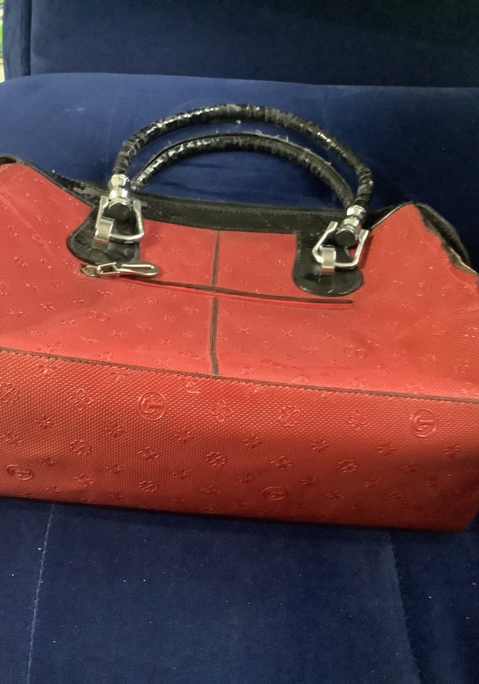 Kırmızı parlak deri kadın çanta, tokalı saplara sahip ve hafif yılan derisi desenlidir. Sokak stili için uygundur.