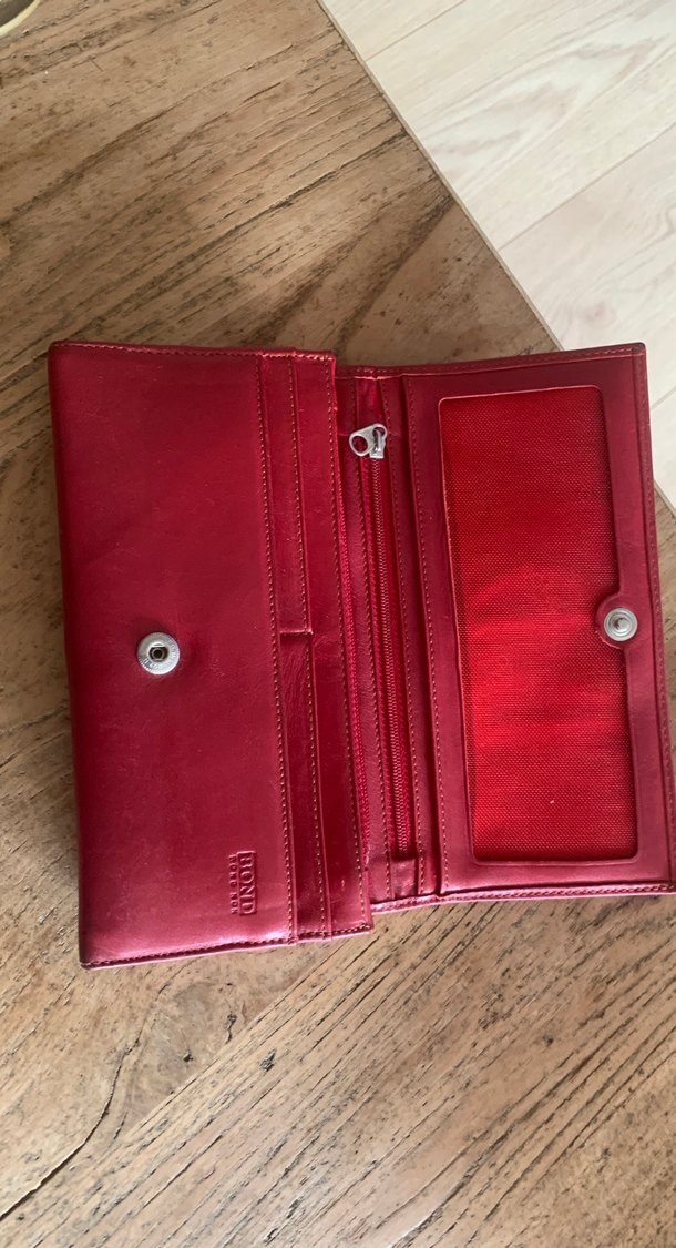 Parlak kırmızı deri kadın cüzdanı, fermuarlı bölmesiyle güvenli saklama sağlar. Minimalist tasarımı günlük kullanıma uygundur.