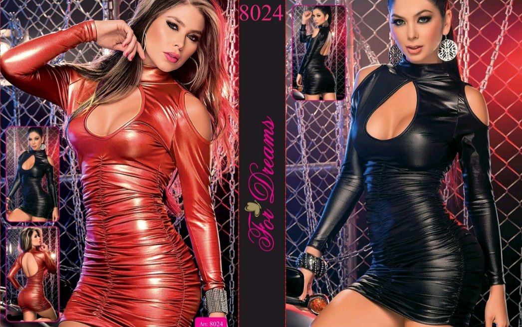 Kırmızı parlak deri, straplez yaka ve askılı kollara sahip dar kesim mini elbise. Cesur yılan deseniyle partiler için uygundur. Model no: 8024.