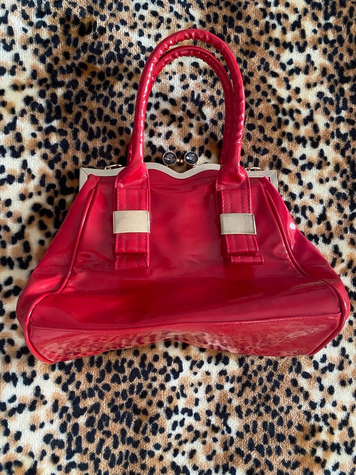 Kırmızı parlak deri, tokalı askılı kadın çanta. Cesur Parisli gotik tarzı yansıtır, romantik akşamlar için uygun. Desensiz şık tasarım.