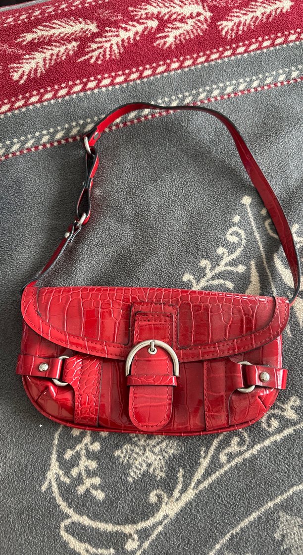 Kırmızı parlak deri yılan desenli kadın çantası, tokalı kapak detayıyla trendy casual sokak stiline uygun.