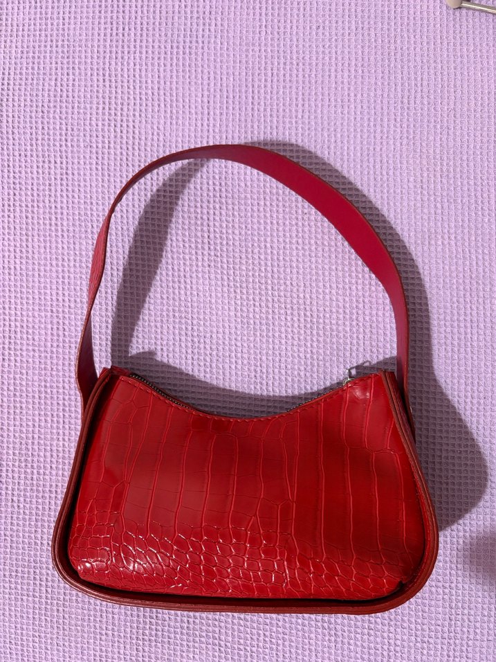 Kırmızı parlak deri, yılan desenli ve tokalı tasarıma sahip cesur kadın çantası, minimalist sokak modasına uygun günlük kullanım için ideal.