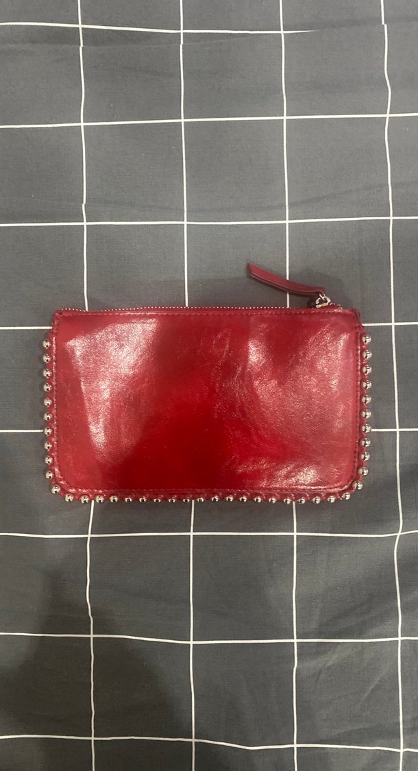 Kırmızı parlak deri zımbalı kenarlara sahip, fermuarlı kadın portföy çanta. Rock punk tarzı ve Parisli avangart dokunuşuyla günlük kullanıma uygun. hıcbır sorunu yoktur