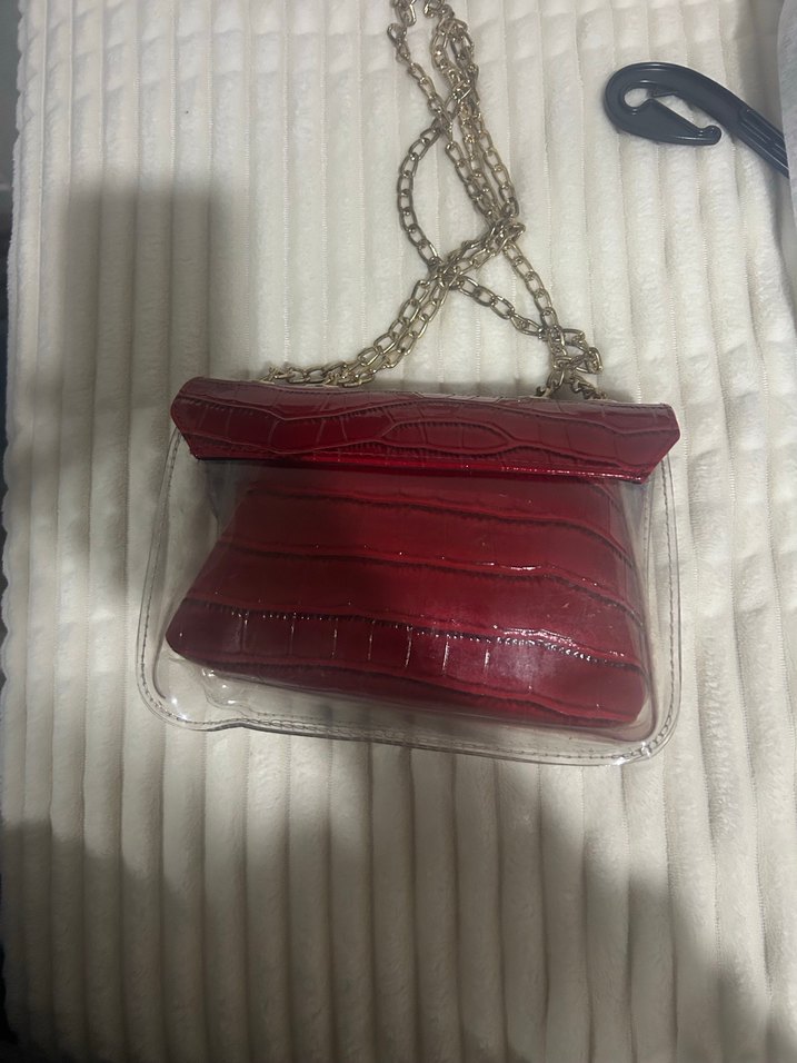 Parlak kırmızı deri, yılan desenli ve zincir detaylı kadın çanta. Şeffaf dış katman ve çıkarılabilir iç kese içerir.