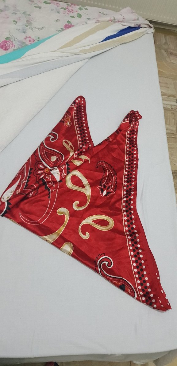 Kırmızı parlak ve desenli, bohem ve retro tarzda, sentetik kumaştan kadın fular eşarp.Kirmizi desenli saten eşarp kullanilmadi.Ölcü 91×92,5 cm