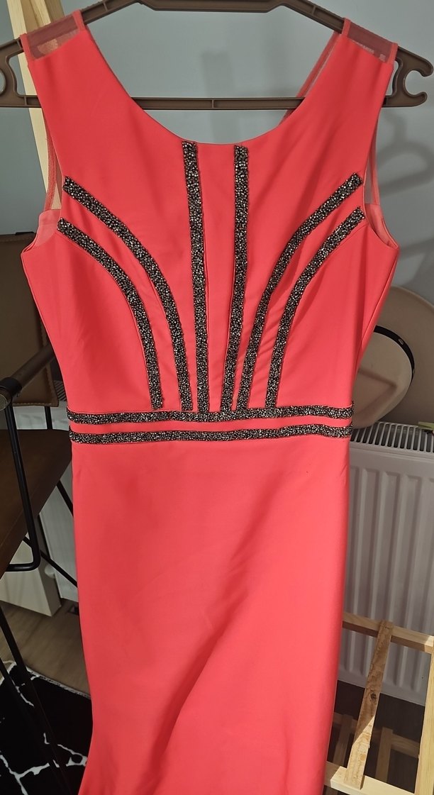 Kırmızı Parlak Desenli Kadın Uzun Abiye Elbise