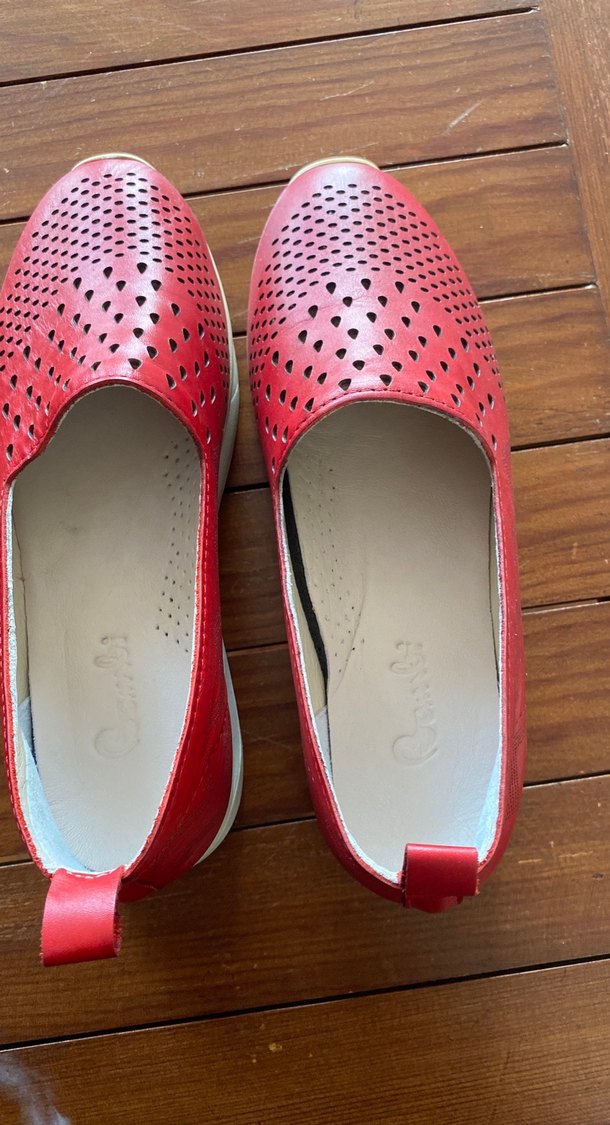 Kırmızı parlak renkte, dolgu topuklu ve tokalı kadın babetler. Delikli tasarımıyla nefes alabilirlik sağlar. Trendy ve rahat bir görünüme uygundur.