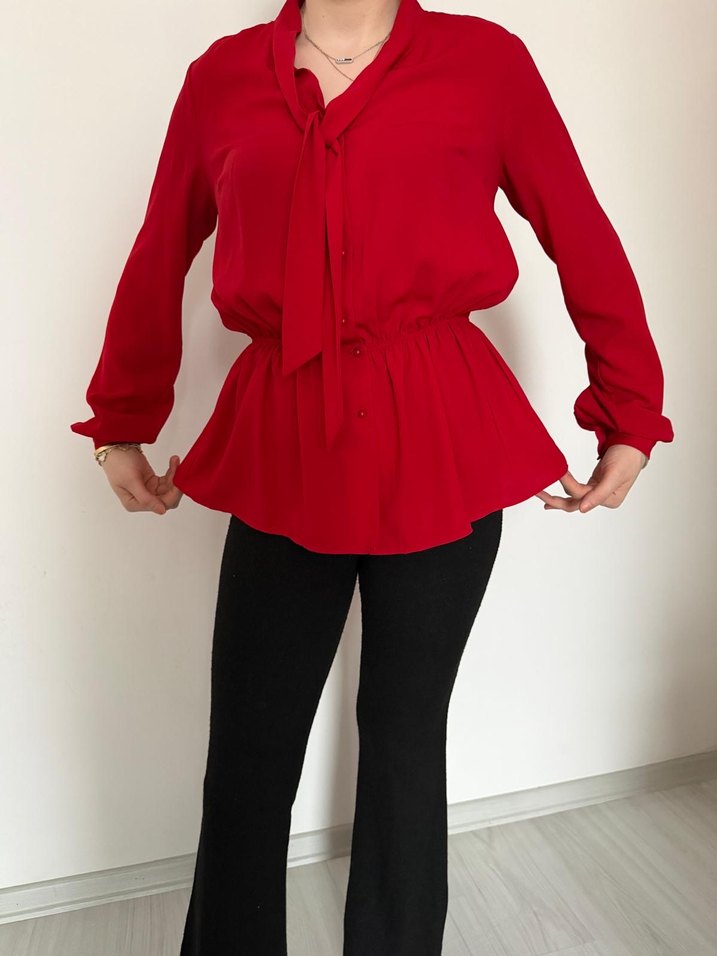 Kırmızı parlak renkte, düğmeli ve uzun kollu, yüksek yakalı, bol kesim bluzu. Ofis için uygun, ipeksi dokuda. ✨