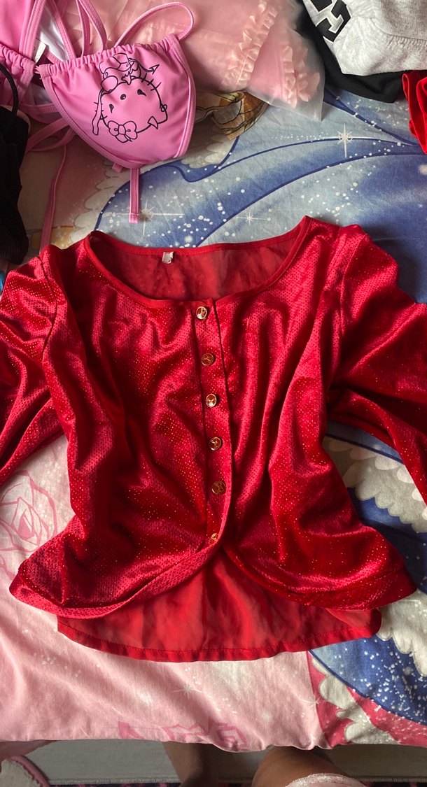 Kadife parlak kırmızı, V yakalı, uzun kollu, düğmeli ve bol kesim sentetik kumaş bluz. Streetwear tarzı için uygun.