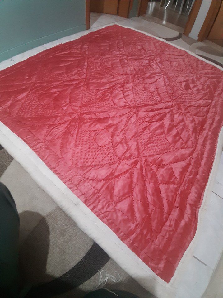 Parlak kırmızı renkte, düz kapitone desenli yorgan. Yumuşak ve parlak yüzeyiyle odanıza canlılık katabilir. ️özel tasarım çok az kullanıldı arka tarafı sandık lekesi olmuş dolapta duruyirdu