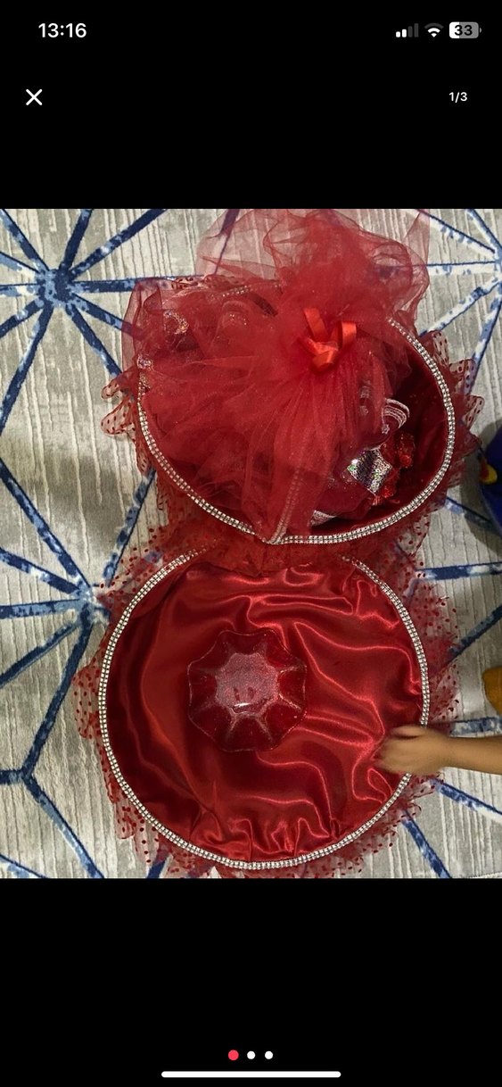 Parlak kırmızı kumaş ve fırfır detayları, ışıltılı süslemelerle geleneksel ve şık bir düğün aksesuarı sunar.