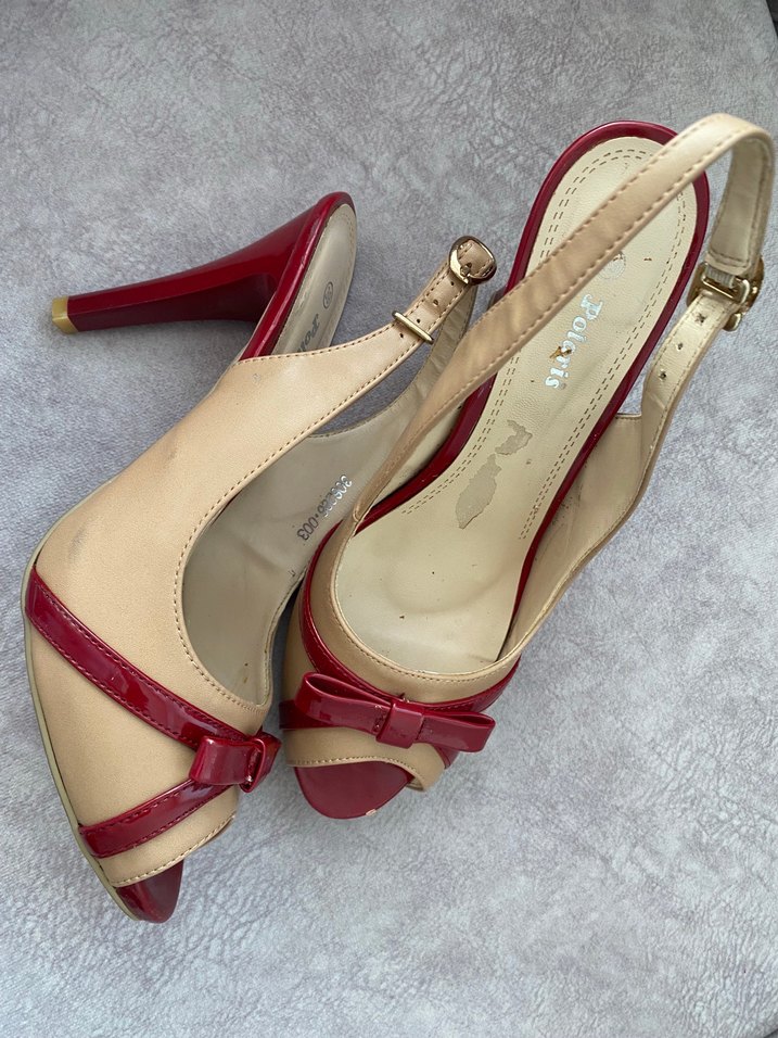 Kırmızı parlak, fiyonklu yüksek topuklu ayakkabı. Modern ve klasik tarzı birleştirir. Kauçuk malzemeden, romantik akşamlar için uygun. ❤️