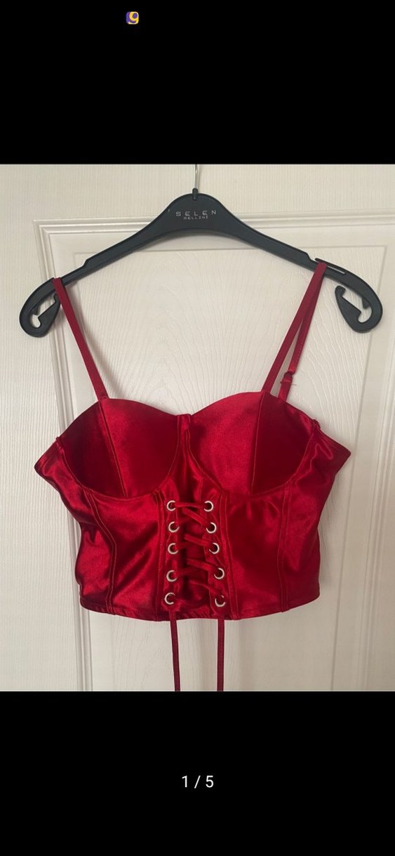 Kırmızı parlak mini büstiyer, saten dokulu, ince askılı ve düğmeli detaylı, cesur gotik tarz için uygun. s beden