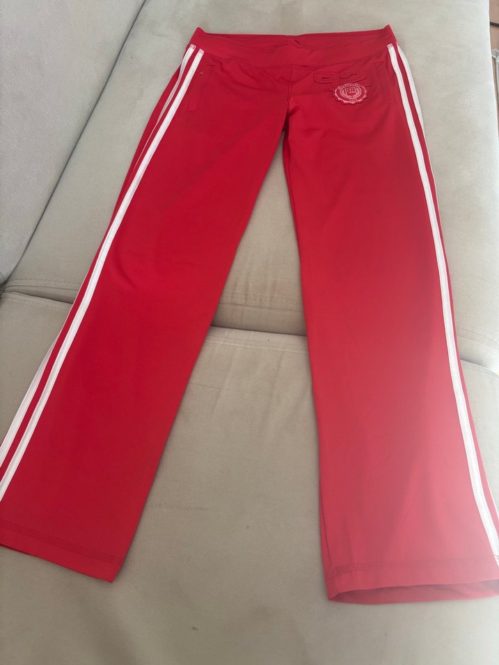Parlak kırmızı, elastik bel bantlı ve beyaz yan çizgili, dar kesim kadın eşofman altı. Spor ve günlük kullanım için uygun.