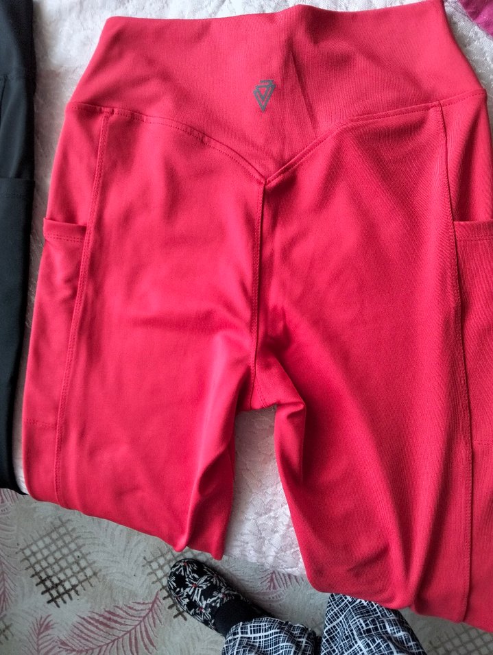 Parlak kırmızı, detaylı kadın taytı. Sentetik kumaştan, midi boy ve sportif sokak giyimine uygun. ♀️