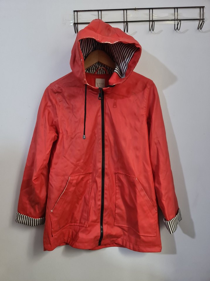 Parlak kırmızı renkte, kapüşonlu ve uzun kollu, fermuarlı ve çizgili iç astarlı, orta boy kadın yağmurluğu. Outdoor sokak stili için uygundur. ☔️