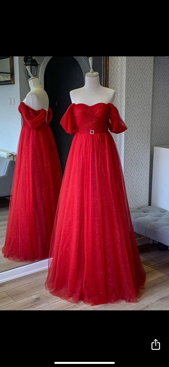 Parlak kırmızı renkte, kayışlı ve askılı kollu, straplez yaka uzun abiye elbise. Düzenli kesim ve modern klasik tarzda, düğün için uygun.