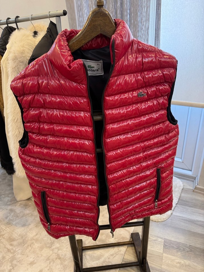 Parlak kırmızı sentetik kumaştan, kısa ve dik yakalı, fermuarlı cepli, trend sokak stiline uygun erkek yeleği.