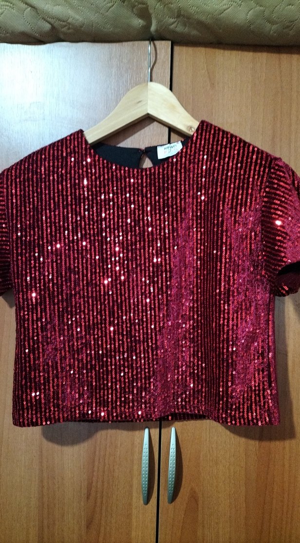 Kısa kollu, yuvarlak yakalı, kırmızı ışıltılı simli dar kesim kadın bluz. Sentetik kumaştan, kısa boyda, romantik akşamlar için uygun. ✨