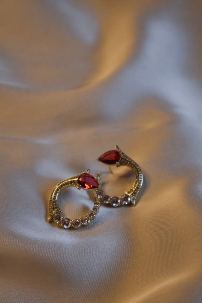 Kırmızı parlak taşlarla süslenmiş, modern klasik stile uygun midi uzunlukta şık küpeler.