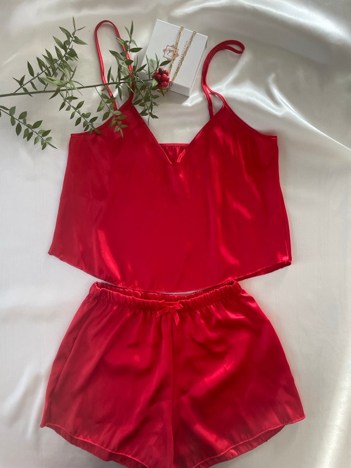 Kırmızı parlak kumaştan, askılı ve bol kesim üst ile şortlardan oluşan minimalist ve çağdaş kadın pijama takımı. Farklı bedenleri var