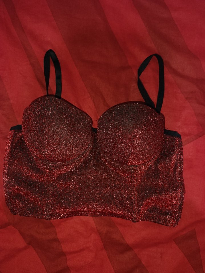 Parlak kırmızı sentetik kumaştan, straplez ve kısa kesim mini büstiyer. Fıtilli ve gösterişli, gotik tarz için uygun. Parti için ideal. ✨ ister askılı ister straplez