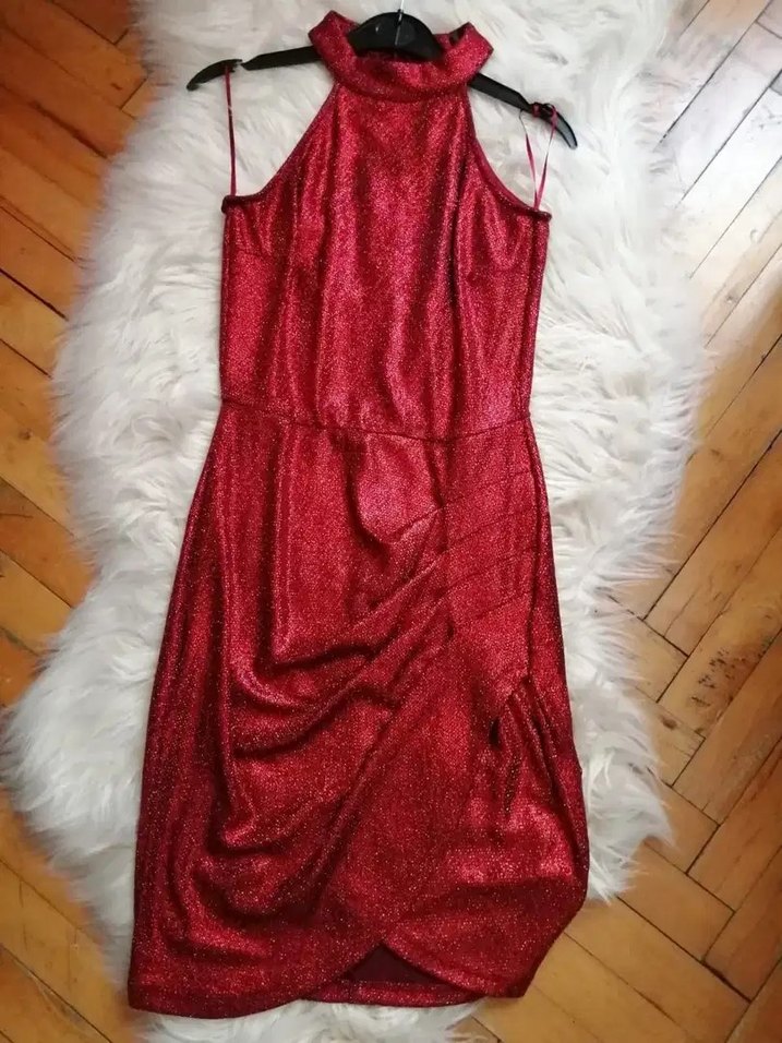 Kolsuz kırmızı abiye elbise, yüksek yakalı ve drapeli, vücuda oturan kesimiyle dikkat çeker. Parlak kumaşıyla parlak ve gösterişli, mini boyda ve desensizdir. ✨ Üzerinde Gold pırıltılar vardır. koton ürünüdür hiç giyilmedi. 34/36 beden 45/55 kg arası 130/ 170 cm boy arası uygundur.