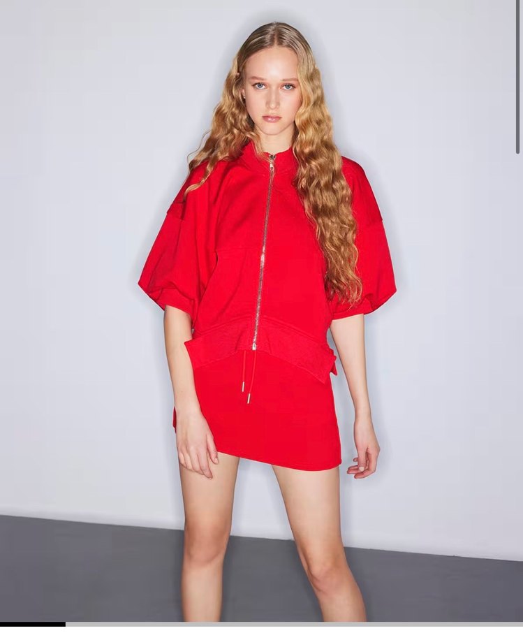 Parlak kırmızı, bol kesim mini etek ve sweatshirt , yumuşak ve sıcak dokusuyla günlük kullanım ve sokak stiline uygundur. Trendsetterlar için zahmetsiz şıklık sunar.