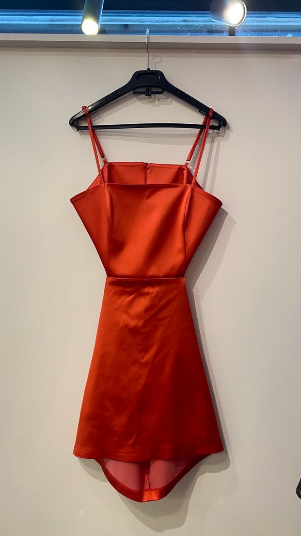 Kırmızı, parlak kumaştan, ipli askılı , drapeli mini elbise. Fitted kesimi ve minimal tasarımı romantik akşamlar için ideal.