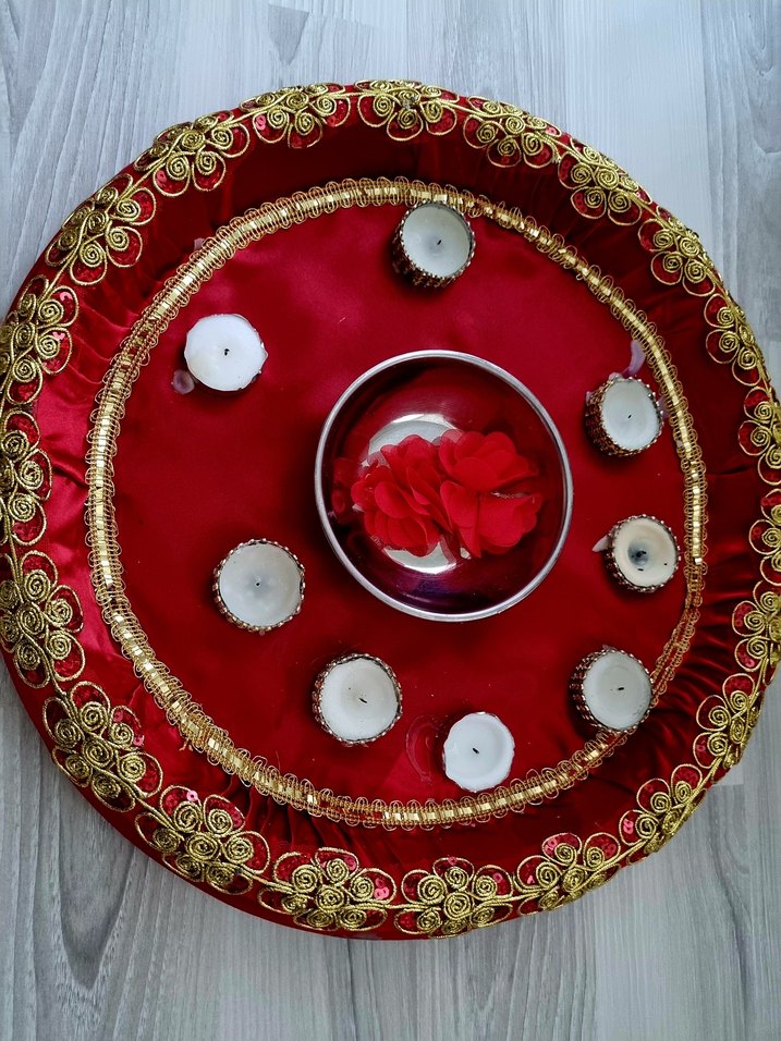 Parlak kırmızı renkte, altın işlemeli dekoratif mumluk seti. Ortasında cam kasede kırmızı yapraklar ve çevresinde beyaz mumlar bulunur. ️
