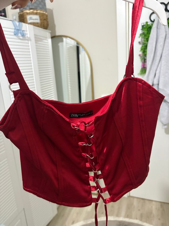 Parlak nakışlı detaylara sahip, kırmızı renkli, sıkı kesim strappy askılı ve fermuarlı midi uzunlukta büstiyer. Sentetik kumaştan, cesur goth tarzına uygun. ❤️ sadece yılbaşında giydim