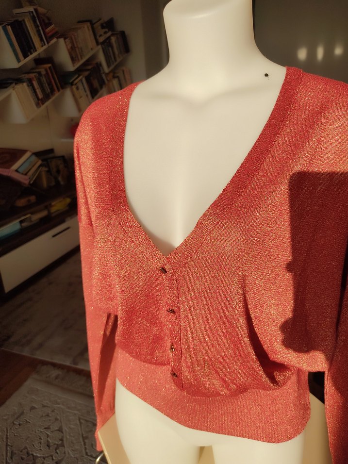 Kırmızı parlak örgü kadın kazağı, yuvarlak yaka ve uzun kolludur. Rahat kesimi ve midi boyu ile günlük kullanıma uygundur. Sentetik kumaştan üretilmiştir.