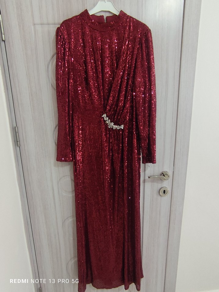 Parlak kırmızı payetli, uzun kollu, oturan kesim abiye elbise. Yılan desenli, yuvarlak yakalı ve belde süslemeli, modern klasik tarzda, özel davetler için uygundur. ✨