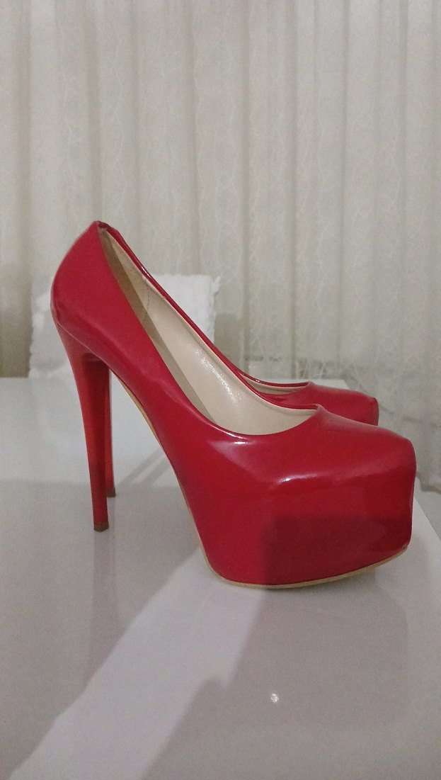 Kırmızı parlak, kauçuk malzemeden yapılmış yüksek platform topuklu stiletto. Cesur ve modern tarzıyla romantik akşamlar için uygun.