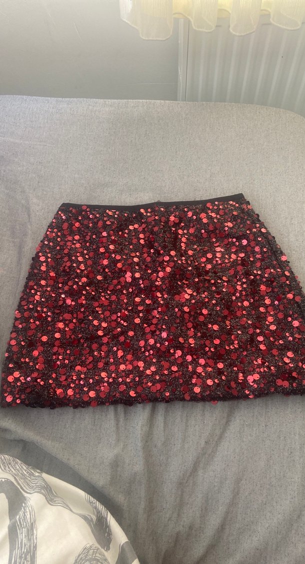 Koyu kırmızı ışıltılı ve işlemeli desenlere sahip, dar kesim mini etek. Romantik gece için gösterişli ve iddialı bir seçim. ✨