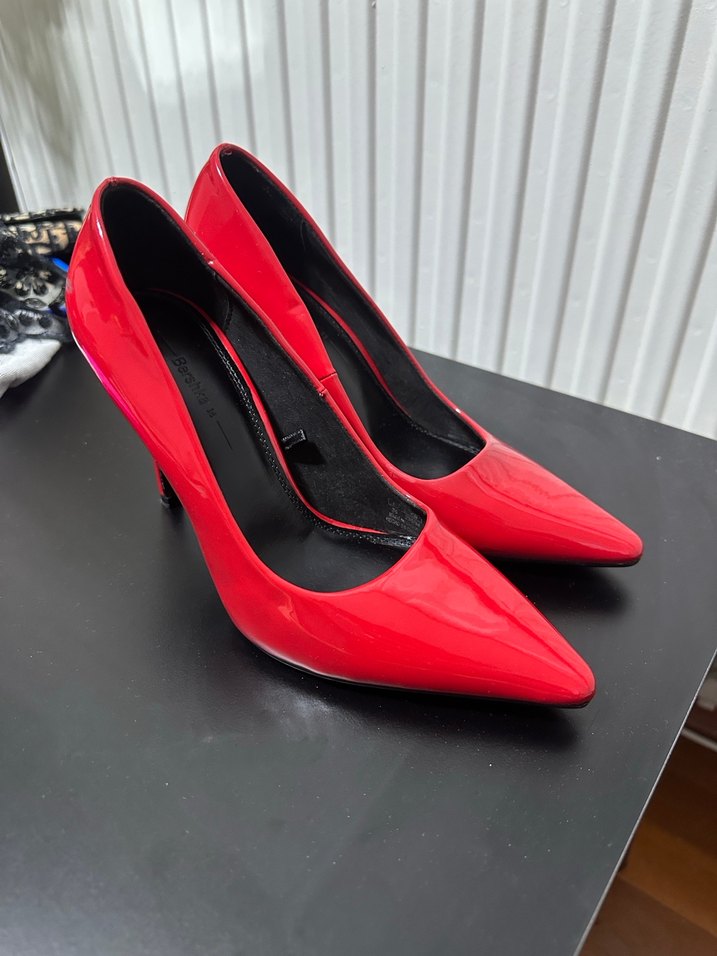 Kadınlar için parlak kırmızı rugan stiletto topuklu ayakkabılar, klasik sivri burun. Ofis kullanımı için canlı ve cesur bir tarz sunar.
