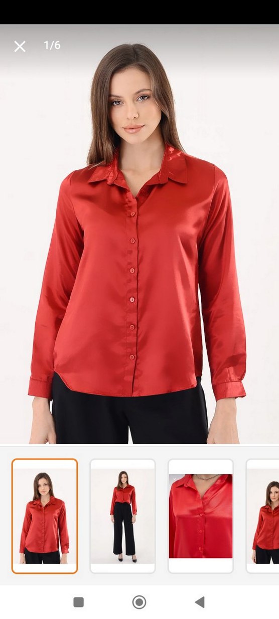 Kadın gömlek, V yaka ve düğmeli ön kısmıyla uzun kolludur. Satenimsi kumaştan yapılmış, regular fit ve parlak kırmızı renktedir, ofis için uygundur.