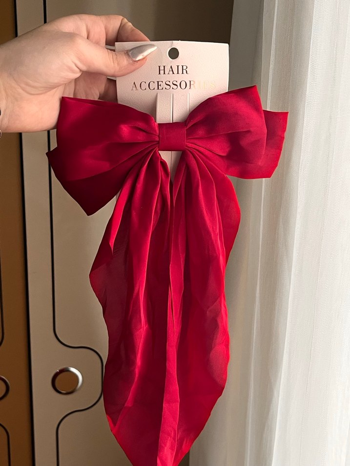 Kırmızı parlak saten kumaştan yapılmış fiyonk saç aksesuarı,