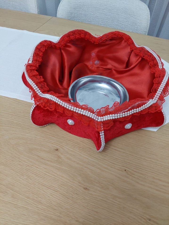 Parlak kırmızı renkli, yumuşak saten astarlı ve inci detaylı şık sepet. İçinde metal tabak bulunmaktadır.