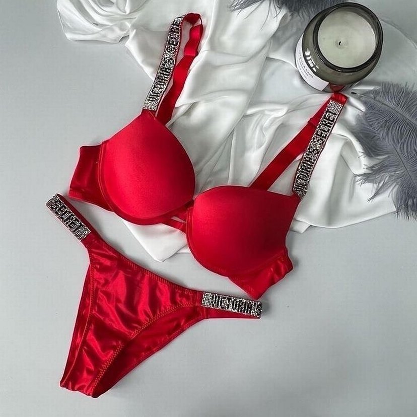 Parlak kırmızı kumaştan, süslemeli askılı, ışıltılı sütyen ve külot takımı. ✨