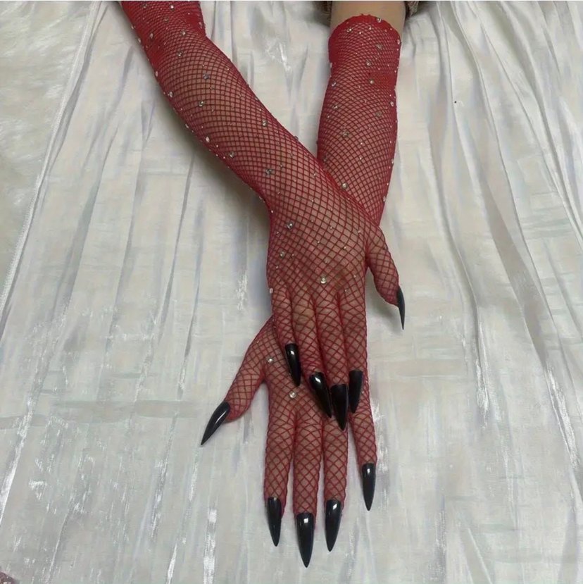 Kırmızı Parlak Taşlı Takma Tırnaklı Gotik File Eldiven