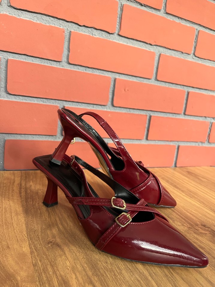 Kırmızı parlak stiletto topuklu ayakkabılar, çift tokalı kayış ve sivri burun tasarımıyla, pürüzsüz kauçuk materyaldendir. Romantik geceler için ideal.
