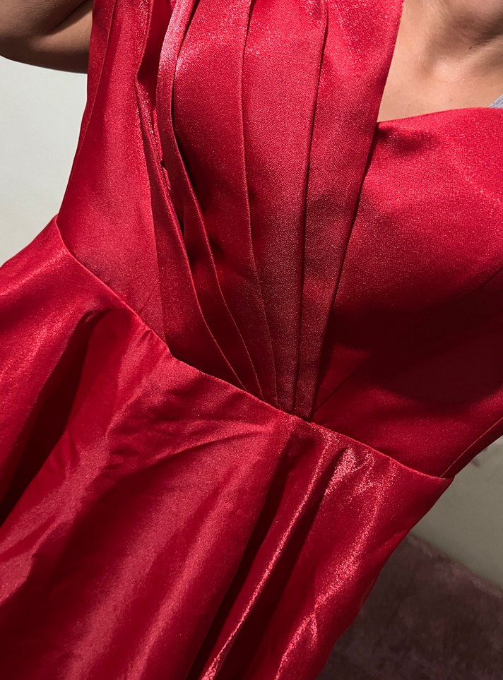 Kırmızı parlak kumaştan, straplez yaka ve ince askılı, drapeli uzun abiye elbise. Modern klasik tarzda, düğünler için uygundur.