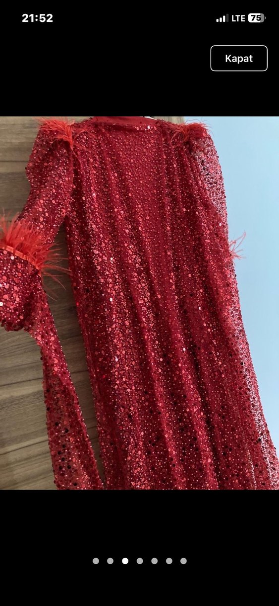 Bu kırmızı, vücuda oturan abiye elbise uzun kollu ve V yaka olup, parıltılı ve işlemeli detaylarla göz alıcı bir parti tarzı sunar. ✨ Mendili ve kemeri dahildir.