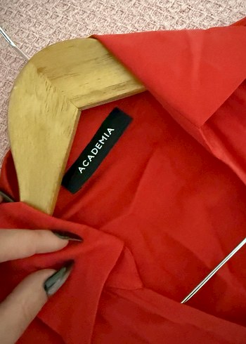 Kırmızı, parlak, uzun kollu, düğmeli, yakası kesimli, vücuda oturan elbise . Satenimsi kumaştan, baskılı desenli ve Academia markalı. ✨ 36/38 bedene uyar yaka altında ufacık belli bile olmayan bir aşınma olmuş sanırım yıkamadan bu sebeple uygun tutuyorum . %95 ipek %5 elestan